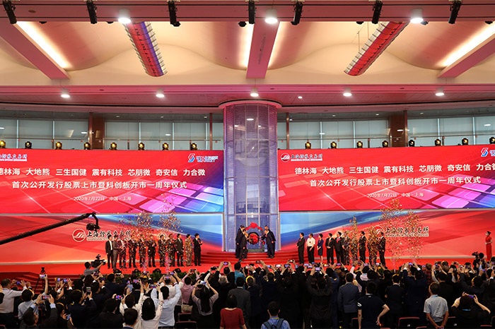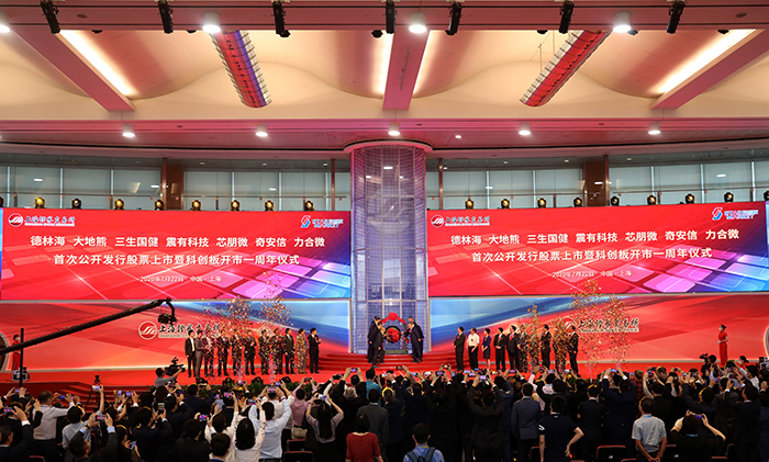 2020年7月22日,科创板开市一周年之际,德林海、大地熊、三生国健、震有科技、芯朋微、奇安信、力合微7家科创板公司首次公开发行股票上市暨科创板开市一周年仪式在上海证券交易所交易大厅举行。至此,科创板上市公司达到140家,总市值逾2.79万亿元,合计融资2179亿元。
